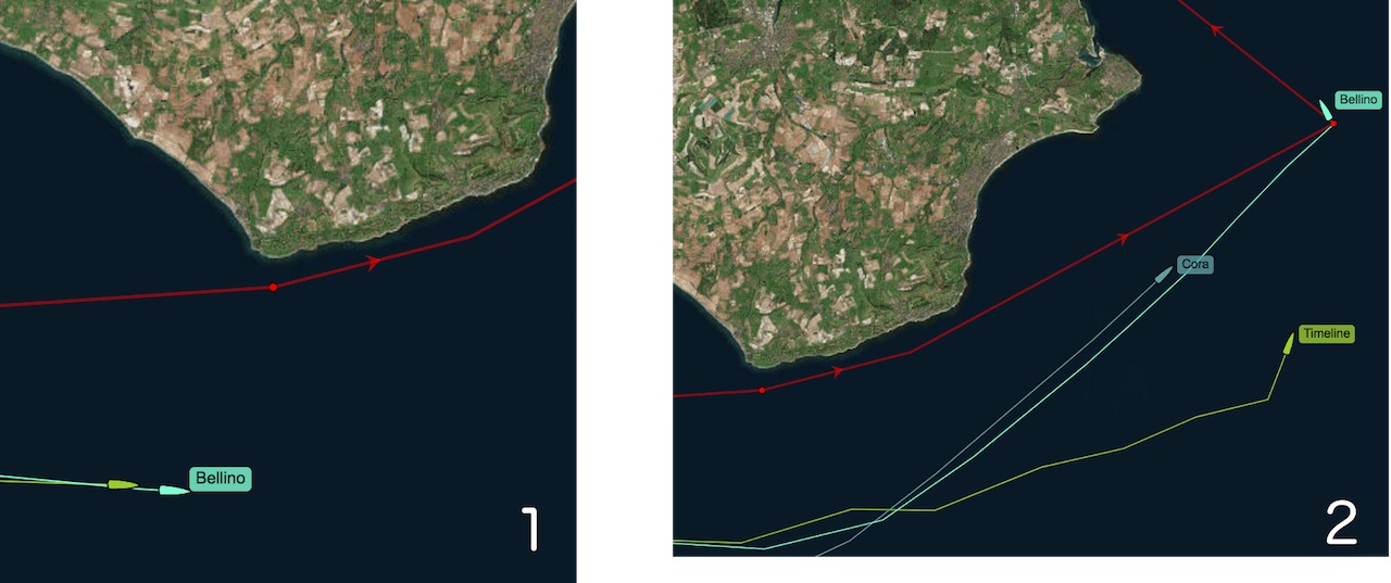 Le bateau bougeait trop pour que le sondeur fonctionne, soit il sortait de l’eau, soit je ne sais pas quoi mais la sonde bougeait de 2 mètres à chaque rafraichissement et a souvent indiqué 1m80. Par ailleurs, en double, il ne pouvait y avoir personne à l’intérieur pour regarder la carte. Hors le jeu est d’aller le plus près possible de la côte pour s'abrîter du courant. On l’a donc fait « au feeling », je suis d’habitude prudent , mais là on a été assez agressifs et notre trajectoire est proche de celles de nos camarades. Bellino a été meilleur tactiquement et allait plus vite.